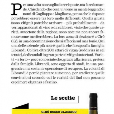 La celebre rivista inglese Decanter ha dedicato alla nostra regione un ampio reportage in cui l'autore, Walter Speller, ha riconosciuto a Librandi il ruolo di leader nello sviluppo del Cirò e ha assegnato al Gravello 2010 e al Magno Megonio 1999 il punteggio più alto tra i vini da lui degustati (